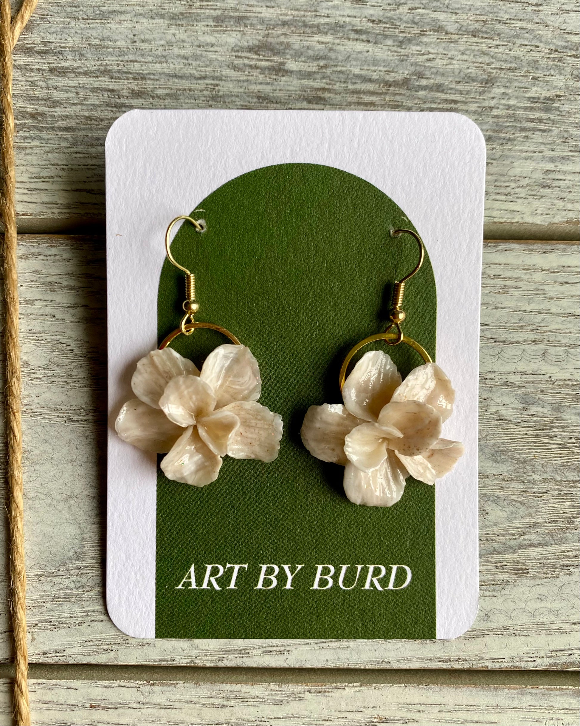 These handmade polymer clay dangle earrings feature delicate flowers carefully sculpted onto metal circles and sealed with glossy resin for a smooth, durable finish. Lightweight with a modern touch, they blend floral charm with a sleek shine—perfect for everyday wear or special occasions.