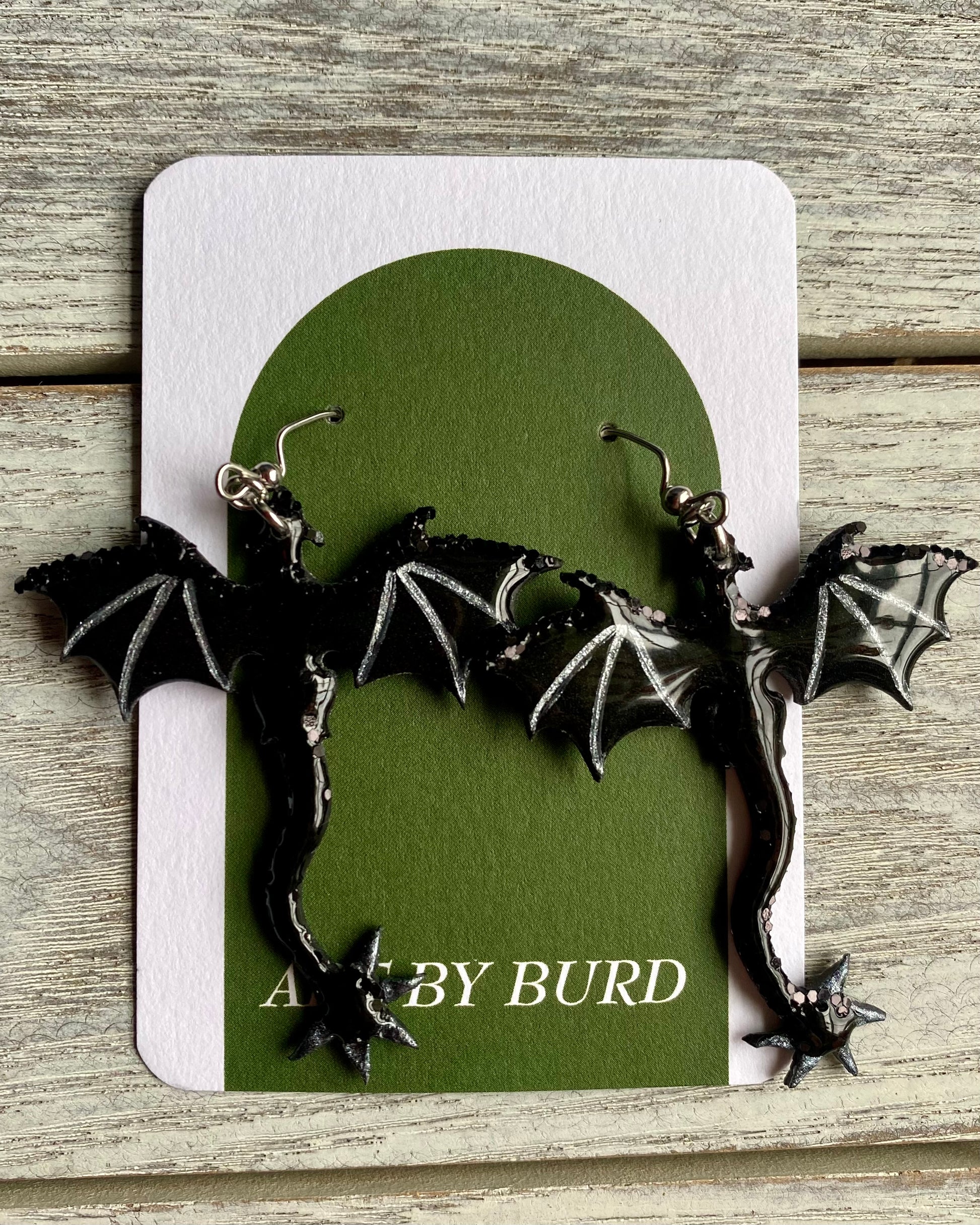 These handmade Dragon earrings capture the mythical beauty of dragons with intricate detailing and a unique artisan touch. Lightweight and striking, each pair is unique and carefully crafted to showcase the fierce yet elegant nature of these legendary creatures. Perfect for fantasy lovers or anyone looking to add a bold, mystical element to their style.