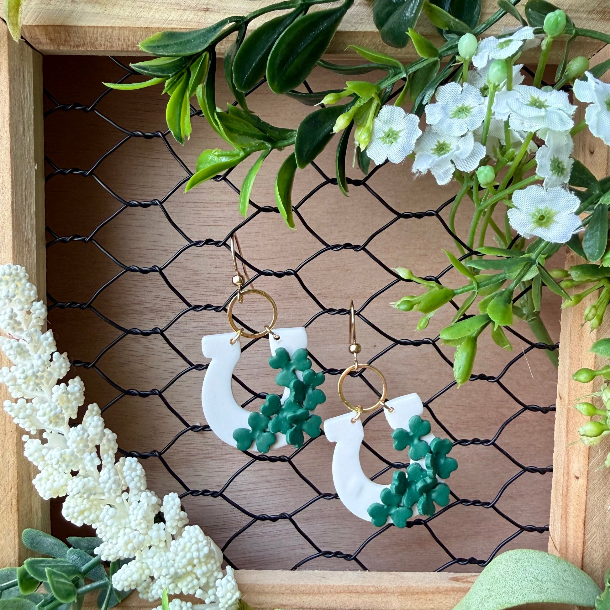 Celebrate the spirit of St. Patrick’s Day with these handmade Lucky Paddy’s Horseshoe Dangles! Featuring ivory polymer clay horseshoes adorned with deep green shamrocks, these lightweight statement earrings are finished with gold-tone hoops for a festive yet timeless look.