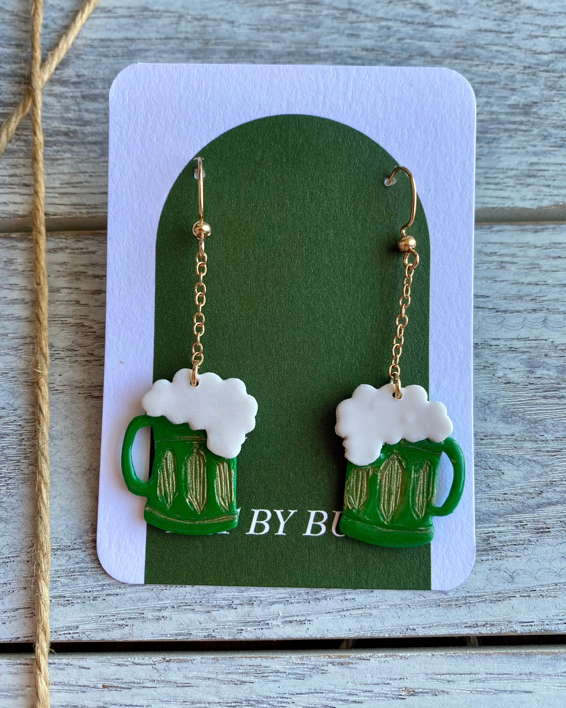 Cheers in style with these charming handmade Pints of Green Beer dangle earrings! Featuring miniature green and gold beer steins with frothy white foam on top, these playful dangles hang from a delicate gold chain for a fun, festive touch. Perfect for St. Patrick’s Day, Oktoberfest, or any beer lover’s collection! Slàinte 🍻