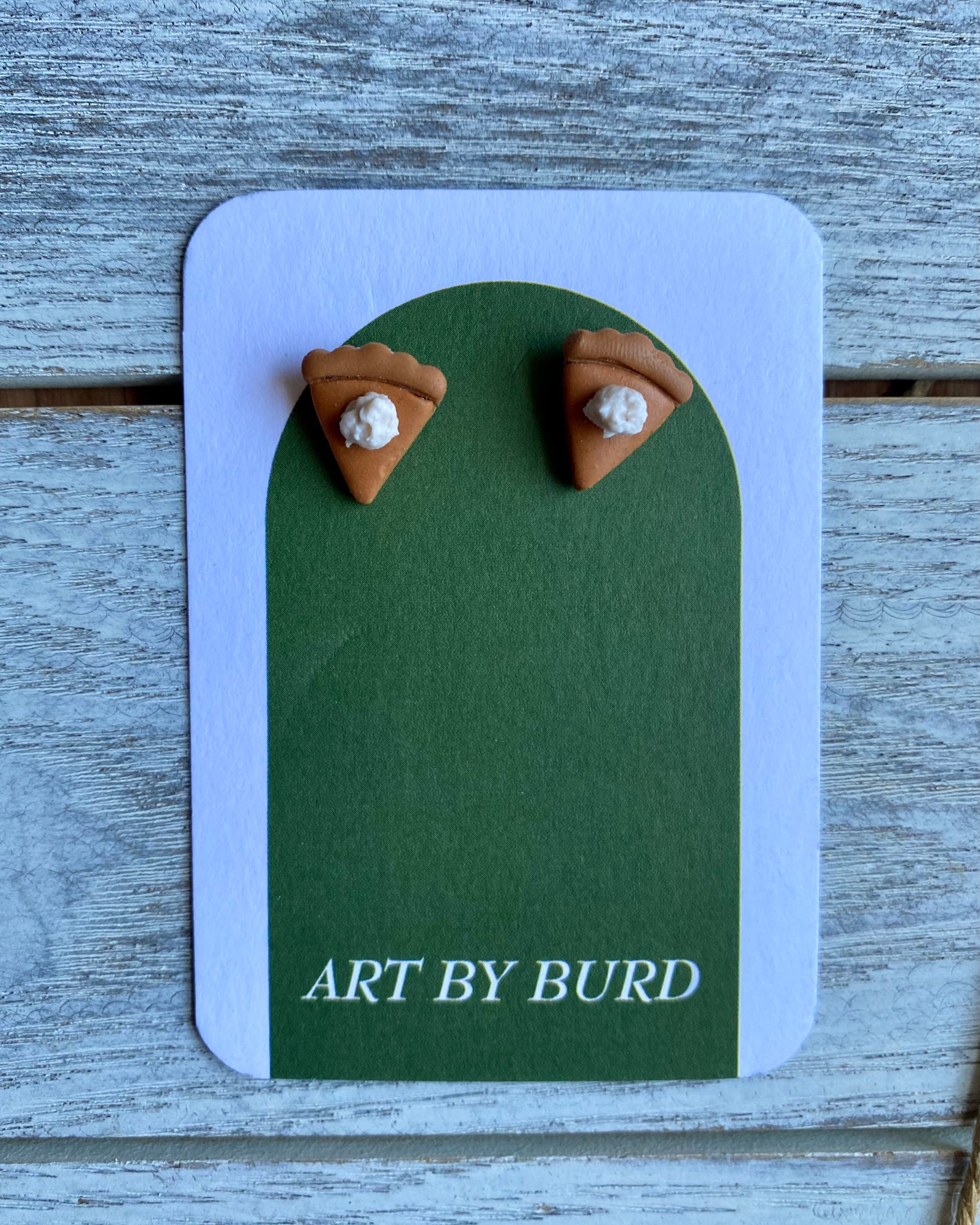 Celebrate cozy season with these Pumpkin Pie Slice Studs - the ultimate fall earrings for pumpkin lovers! Each pair is handmade from polymer clay and designed to look like a tiny slice of pumpkin pie topped with whipped cream. These cute food earrings are lightweight, comfortable, and nickel-free, making them perfect for everyday wear or Thanksgiving gatherings.