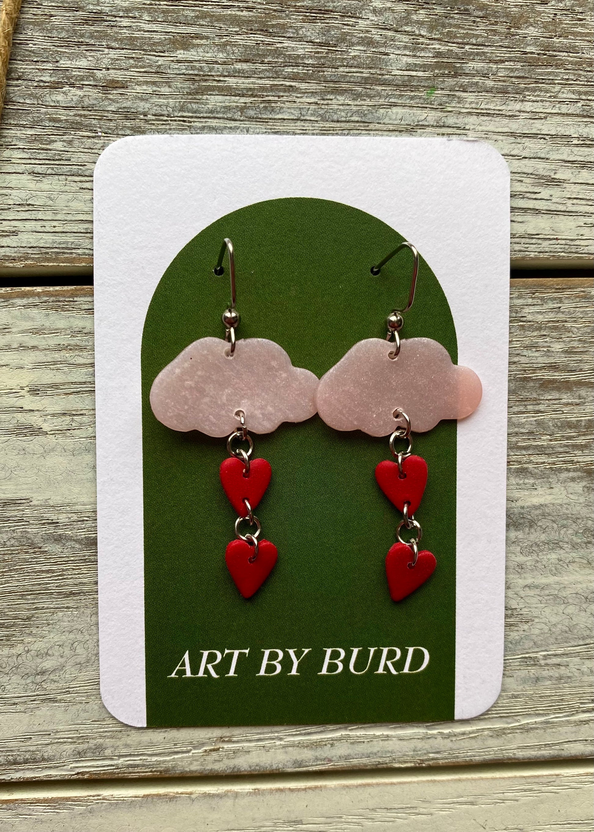 Add a dreamy touch to your look with these handmade Raining Hearts earrings, featuring pink clouds with adorable red hearts gently raining down. Crafted with lightweight polymer clay, each earring captures a whimsical, romantic vibe, perfect for expressing love and positivity. Whether you're celebrating love or just embracing the charm of the season, these earrings are a sweet, playful accessory for any outfit.