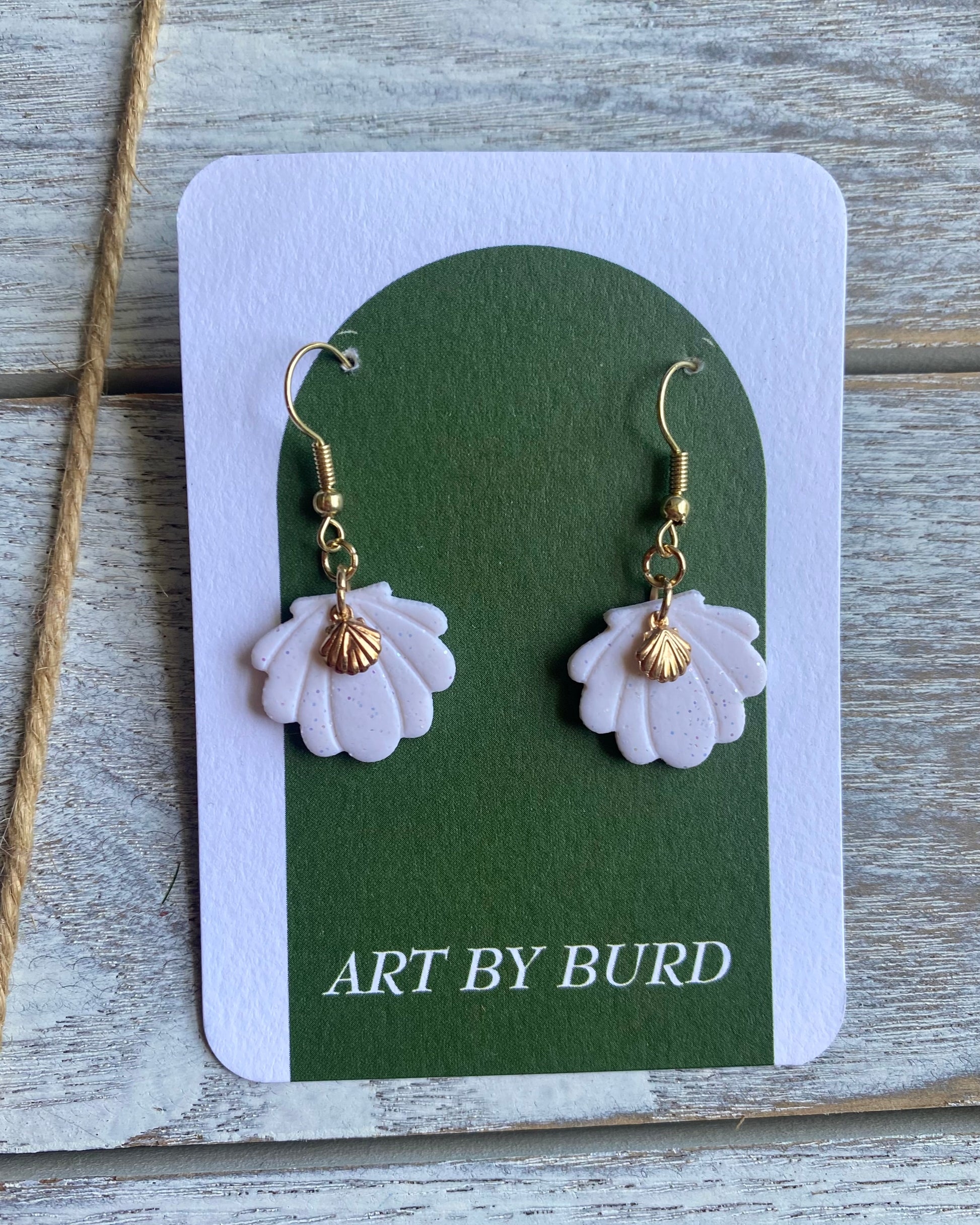 Add a touch of coastal charm with these handmade polymer clay scallop dangle earrings! One pair features a shimmering white scallop shell topped with a smaller metallic gold shell, while the other pair showcases a soft pink shell with a dainty faux pearl drop. Lightweight, beachy, and perfect for summer days or seaside getaways!