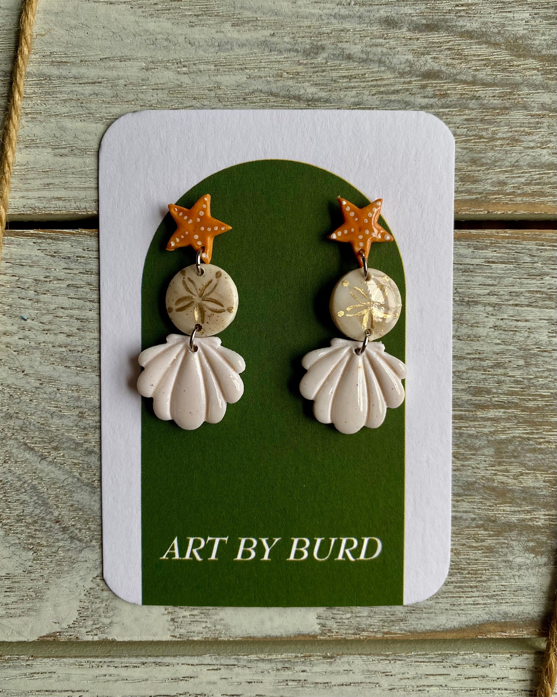 Bring a bit of the beach wherever you go with these handmade polymer clay drop earrings featuring a charming trio of coastal treasures. Each pair includes a handpainted orange starfish stud, a detailed sand dollar center, and a soft pearly shell dangle—all meticulously crafted and sealed with a glossy resin finish for durability and shine. Lightweight and ocean-inspired, these earrings are perfect for beach lovers, summer markets, or adding a whimsical touch to your everyday style.