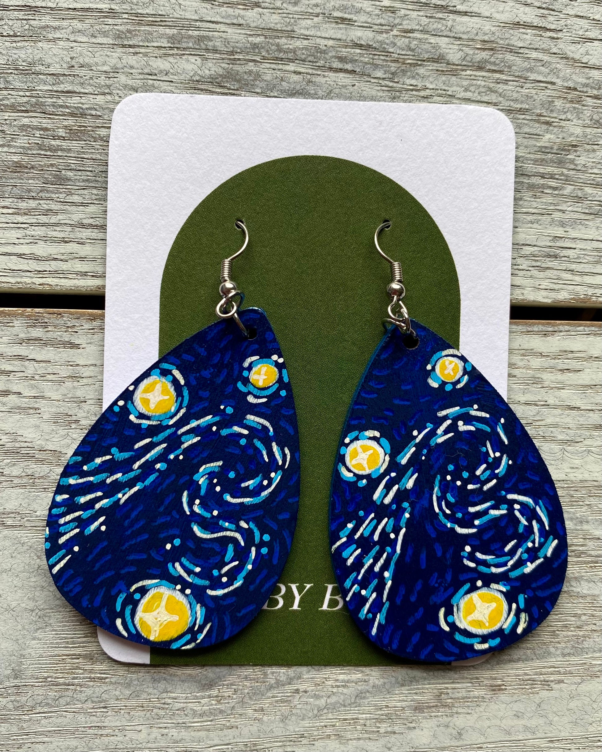 Earrings made with wood base, acrylic paints, aerosol Mod Podge finish, and nickel-free hardware.