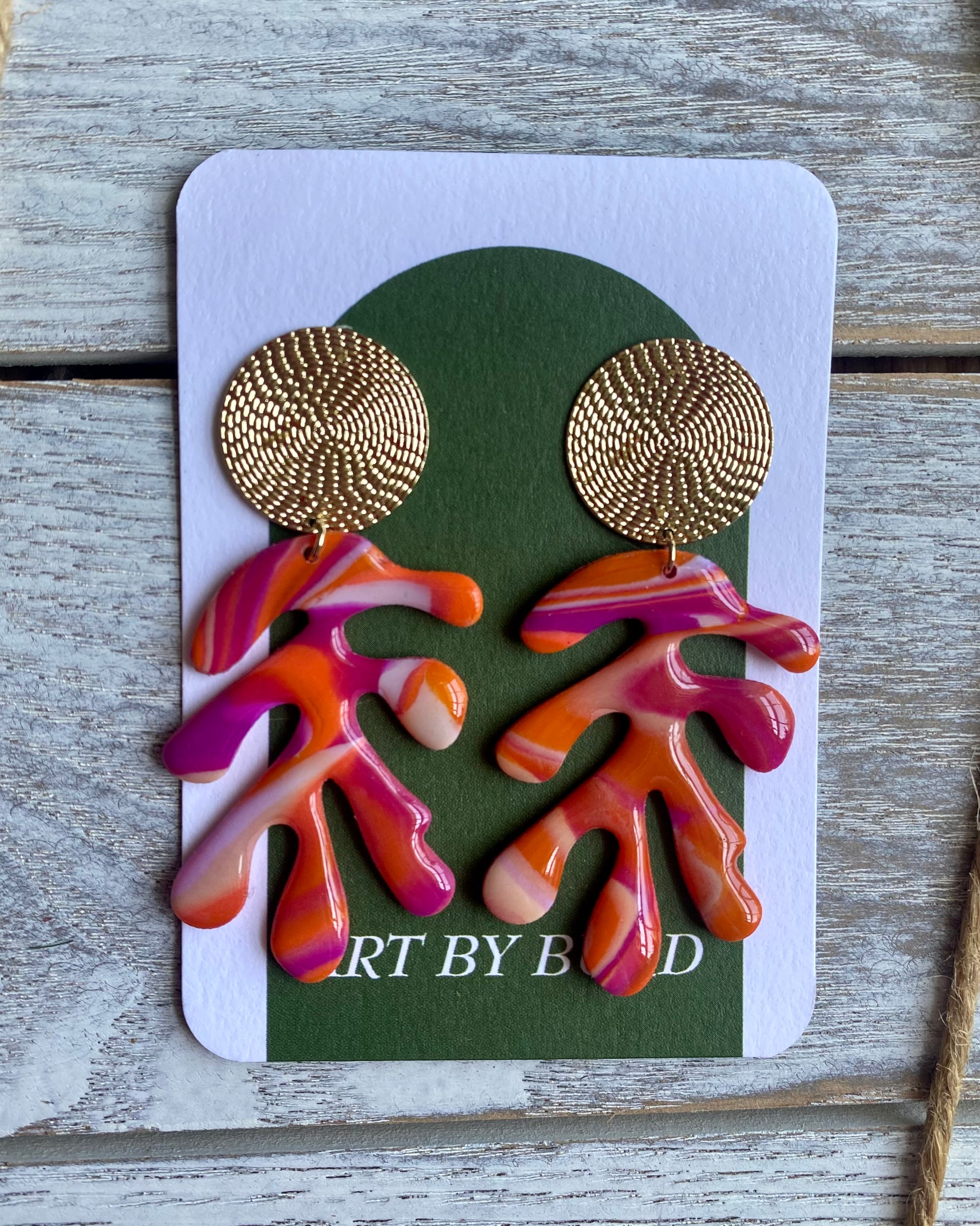 Turn heads with these bold and beachy Sunset Coral Drop Earrings! Handmade from polymer clay, each vibrant coral shape swirls with shades of orange, pink, and magenta for a tropical feel. Finished with textured gold-tone studs, these lightweight earrings bring a pop of playful color and coastal vibes to any outfit.