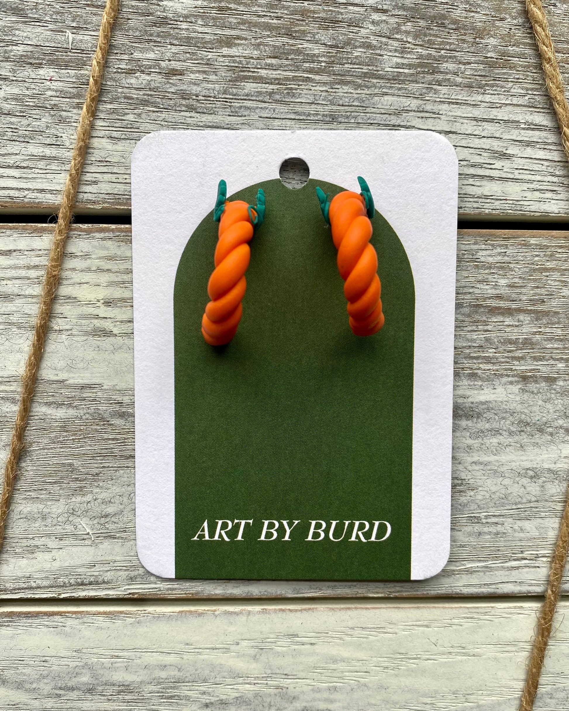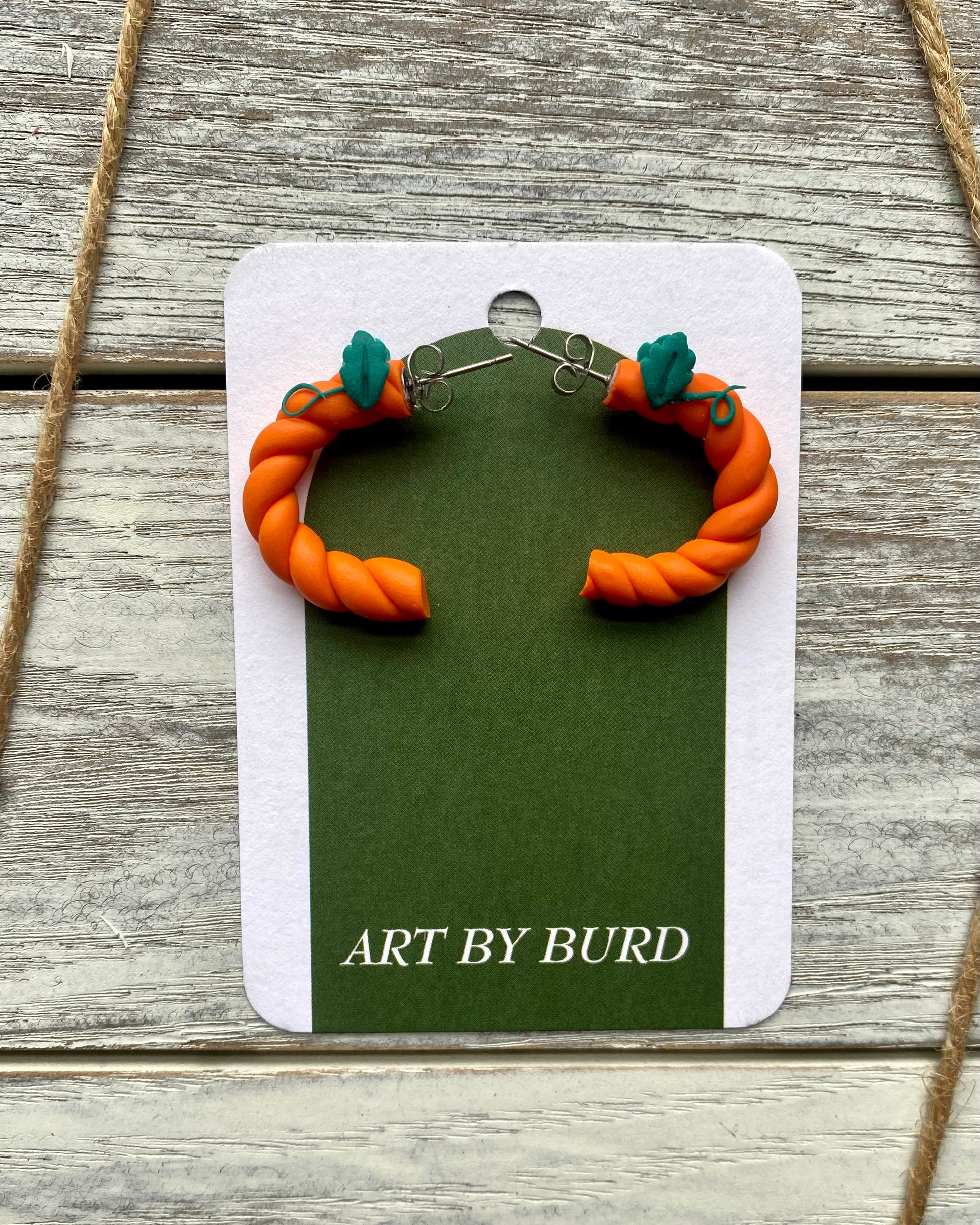 Add the perfect accessory to any fall outfit with these Pumpkin Hoop earrings! Featuring a twisted pumpkin design and small leaves, these lightweight earrings are a great great pop of color to accompany you on all of your autumn activities.